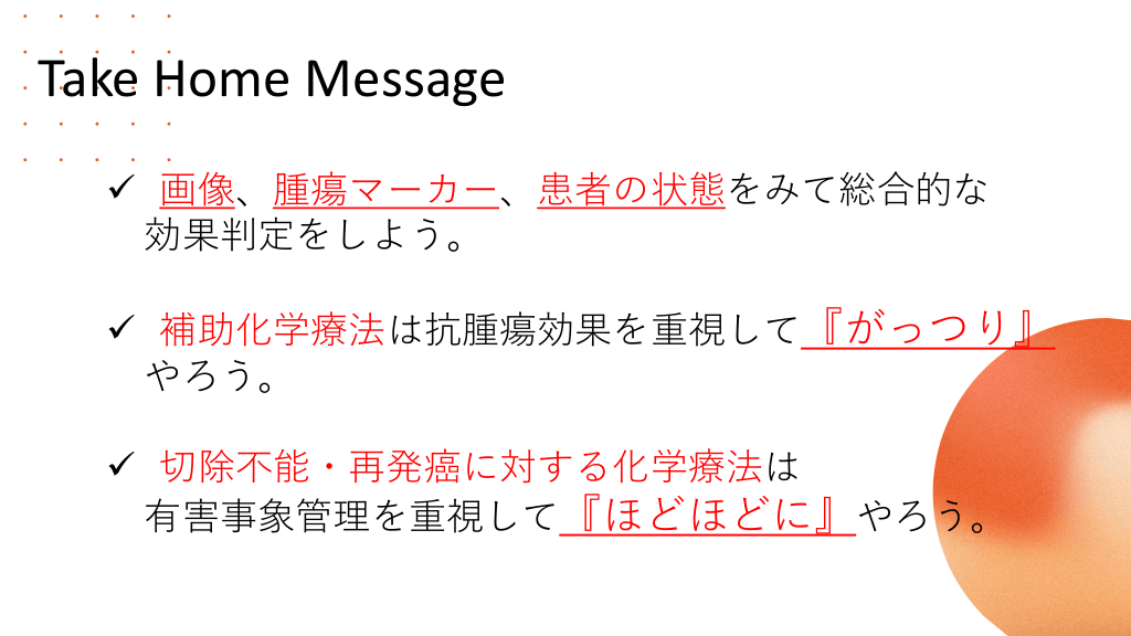 #17. Take Home Message ✓ 画像、腫瘍マーカー、患者の状態をみて総合的な 効果判定をしよう。 ✓ 補助化学療法は抗腫瘍効果を重視して『がっつり』 やろう。 ✓ 切除不能・再発癌に対する化学療法は 有害事象管理を重視して『ほどほどに』やろう。