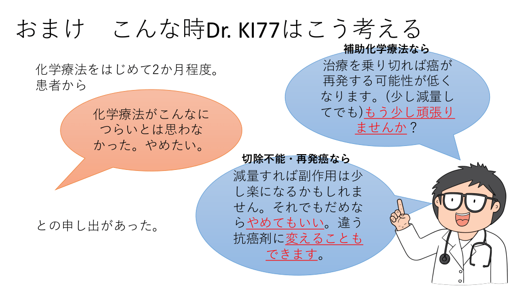 #18. おまけ こんな時Dr. KI77はこう考える 補助化学療法なら 化学療法をはじめて2か月程度。 患者から 化学療法がこんなに つらいとは思わな かった。やめたい。 治療を乗り切れば癌が 再発する可能性が低く なります。(少し減量し てでも)もう少し頑張り ませんか? 切除不能・再発癌なら との申し出があった。 減量すれば副作用は少 し楽になるかもしれま せん。それでもだめな らやめてもいい。違う 抗癌剤に変えることも できます。