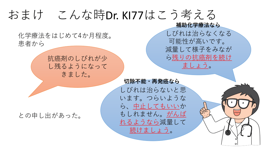#19. おまけ こんな時Dr. KI77はこう考える 補助化学療法なら 化学療法をはじめて4か月程度。 患者から 抗癌剤のしびれが少 し残るようになって きました。 しびれは治らなくなる 可能性が高いです。 減量して様子をみなが ら残りの抗癌剤を続け ましょう。 切除不能・再発癌なら との申し出があった。 しびれは治らないと思 います。つらいような ら、中止してもいいか もしれません。がんば れるようなら減量して 続けましょう。