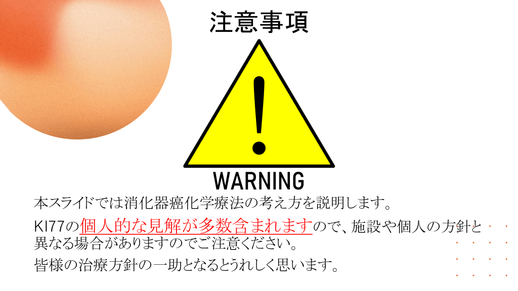 #2. 注意事項 本スライドでは消化器癌化学療法の考え方を説明します。 KI77の個人的な見解が多数含まれますので、施設や個人の方針と 異なる場合がありますのでご注意ください。 皆様の治療方針の一助となるとうれしく思います。