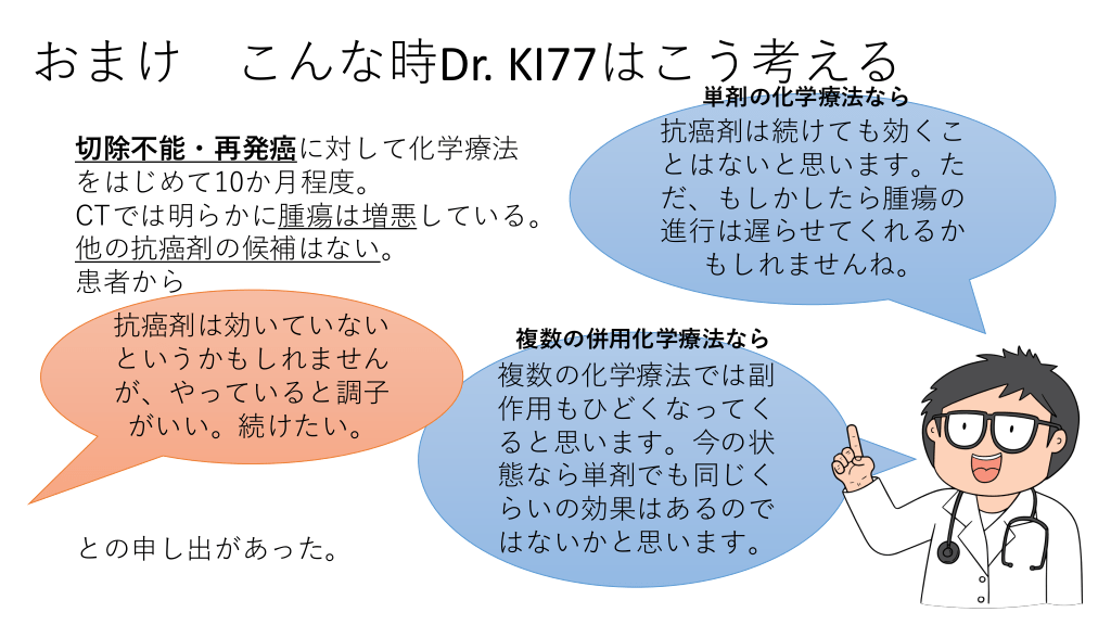 #20. おまけ こんな時Dr. KI77はこう考える 単剤の化学療法なら 切除不能・再発癌に対して化学療法 をはじめて10か月程度。 CTでは明らかに腫瘍は増悪している。 他の抗癌剤の候補はない。 患者から 抗癌剤は効いていない というかもしれません が、やっていると調子 がいい。続けたい。 との申し出があった。 抗癌剤は続けても効くこ とはないと思います。た だ、もしかしたら腫瘍の 進行は遅らせてくれるか もしれませんね。 複数の併用化学療法なら 複数の化学療法では副 作用もひどくなってく ると思います。今の状 態なら単剤でも同じく らいの効果はあるので はないかと思います。