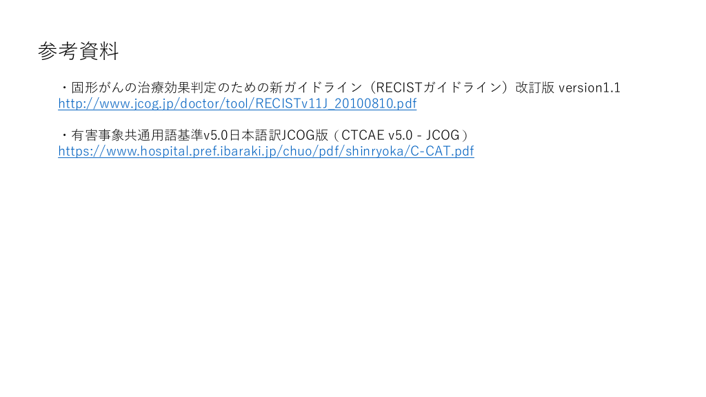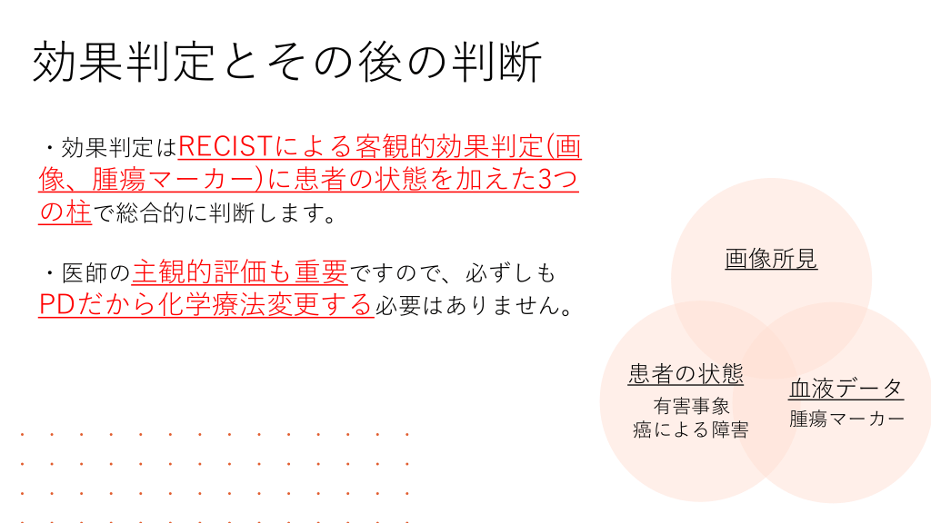#6. 効果判定とその後の判断 ・効果判定はRECISTによる客観的効果判定(画 像、腫瘍マーカー)に患者の状態を加えた3つ の柱で総合的に判断します。 ・医師の主観的評価も重要ですので、必ずしも PDだから化学療法変更する必要はありません。 画像所見 患者の状態 有害事象 癌による障害 血液データ 腫瘍マーカー