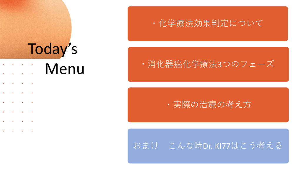 #3. ・化学療法効果判定について Today’s Menu ・消化器癌化学療法3つのフェーズ ・実際の治療の考え方 おまけ こんな時Dr. KI77はこう考える