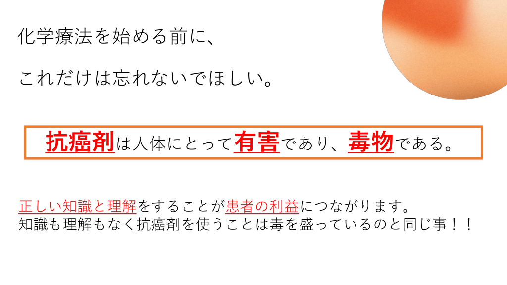 #4. 化学療法を始める前に、 これだけは忘れないでほしい。 抗癌剤は人体にとって有害であり、毒物である。 正しい知識と理解をすることが患者の利益につながります。 知識も理解もなく抗癌剤を使うことは毒を盛っているのと同じ事!!