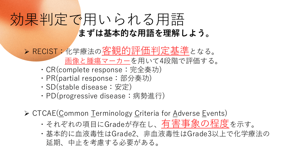 #5. 効果判定で用いられる用語 まずは基本的な用語を理解しよう。 Competitor Analysis ➢ RECIST:化学療法の客観的評価判定基準となる。 Data from our top competitors 画像と腫瘍マーカーを用いて4段階で評価する。 ・CR(complete response:完全奏功) ・PR(partial response:部分奏功) ・SD(stable disease:安定) ・PD(progressive disease:病勢進行) ➢ CTCAE(Common Terminology Criteria for Adverse Events) ・それぞれの項目にGradeが存在し、有害事象の程度を示す。 ・基本的に血液毒性はGrade2、非血液毒性はGrade3以上で化学療法の 延期、中止を考慮する必要がある。