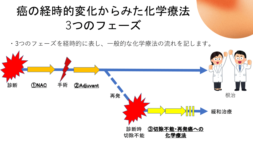 #8. 癌の経時的変化からみた化学療法 3つのフェーズ ・3つのフェーズを経時的に表し、一般的な化学療法の流れを記します。 診断 ①NAC 手術 ②Adjuvant 根治 再発 緩和治療 診断時 ③切除不能・再発癌への 化学療法 切除不能