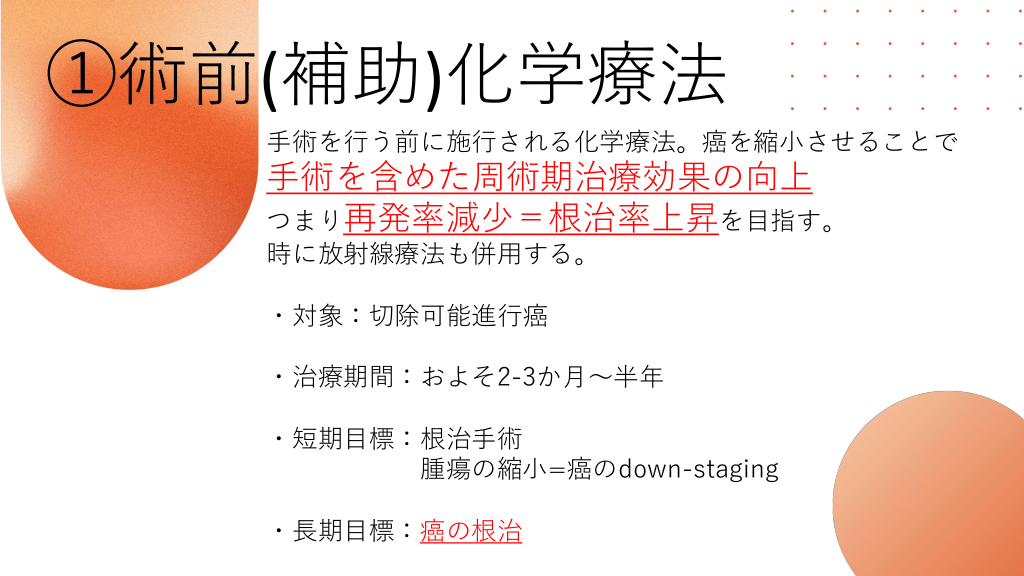 #9. ①術前(補助)化学療法 手術を行う前に施行される化学療法。癌を縮小させることで 手術を含めた周術期治療効果の向上 つまり再発率減少=根治率上昇を目指す。 時に放射線療法も併用する。 ・対象:切除可能進行癌 ・治療期間:およそ2-3か月~半年 ・短期目標:根治手術 腫瘍の縮小=癌のdown-staging ・長期目標:癌の根治