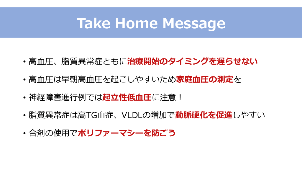 #2. Take Home Message • 高血圧、脂質異常症ともに治療開始のタイミングを遅らせない • 高血圧は早朝高血圧を起こしやすいため家庭血圧の測定を • 神経障害進行例では起立性低血圧に注意! • 脂質異常症は高TG血症、VLDLの増加で動脈硬化を促進しやすい • 合剤の使用でポリファーマシーを防ごう