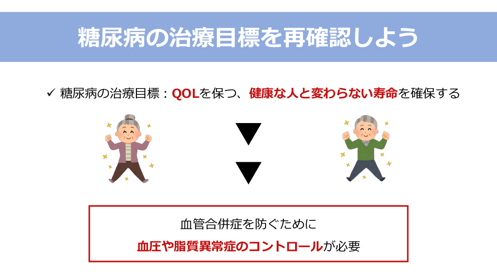#3. 糖尿病の治療目標を再確認しよう ✓ 糖尿病の治療目標:QOLを保つ、健康な人と変わらない寿命を確保する 血管合併症を防ぐために 血圧や脂質異常症のコントロールが必要