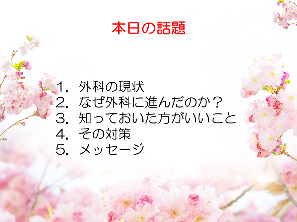 外科系に進もうか躊躇していた方が、もしスライドをみて、これなら大丈夫と外科を選択してくれたら、嬉しく思います。