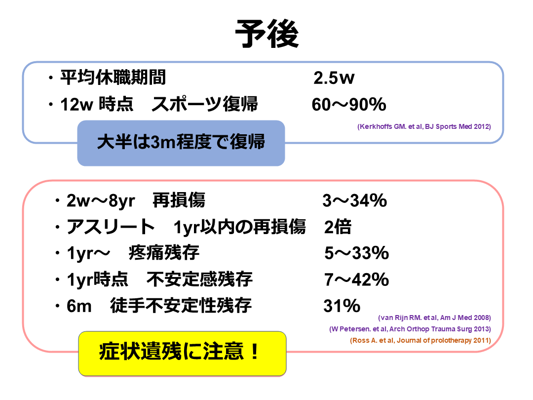 ・1yr時点 不安定感残存 7~42% 大半は3m程度で復帰 3~4割に後遺症 ・2w~8yr 再損傷 3~34%