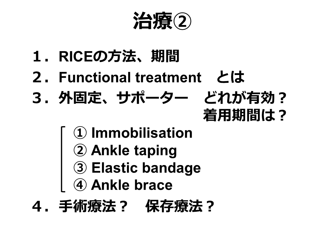#10. 治療② 1.RICEの方法、期間 2.Functional treatment とは 3.外固定、サポーター どれが有効?