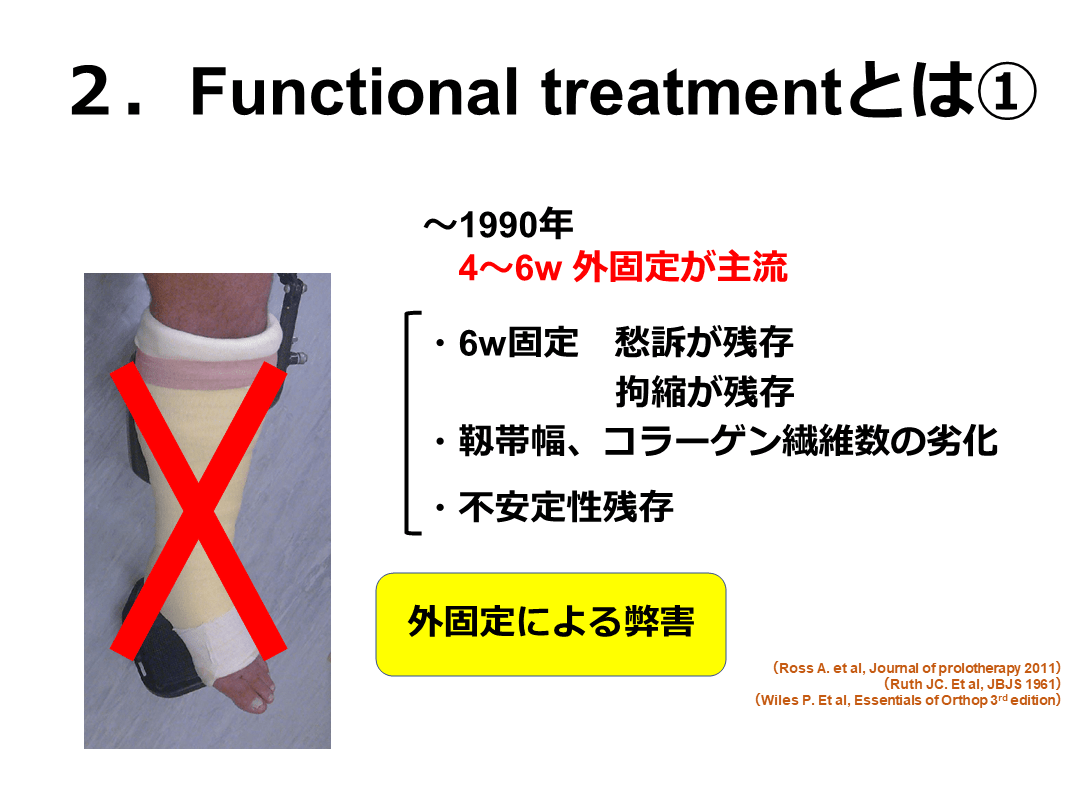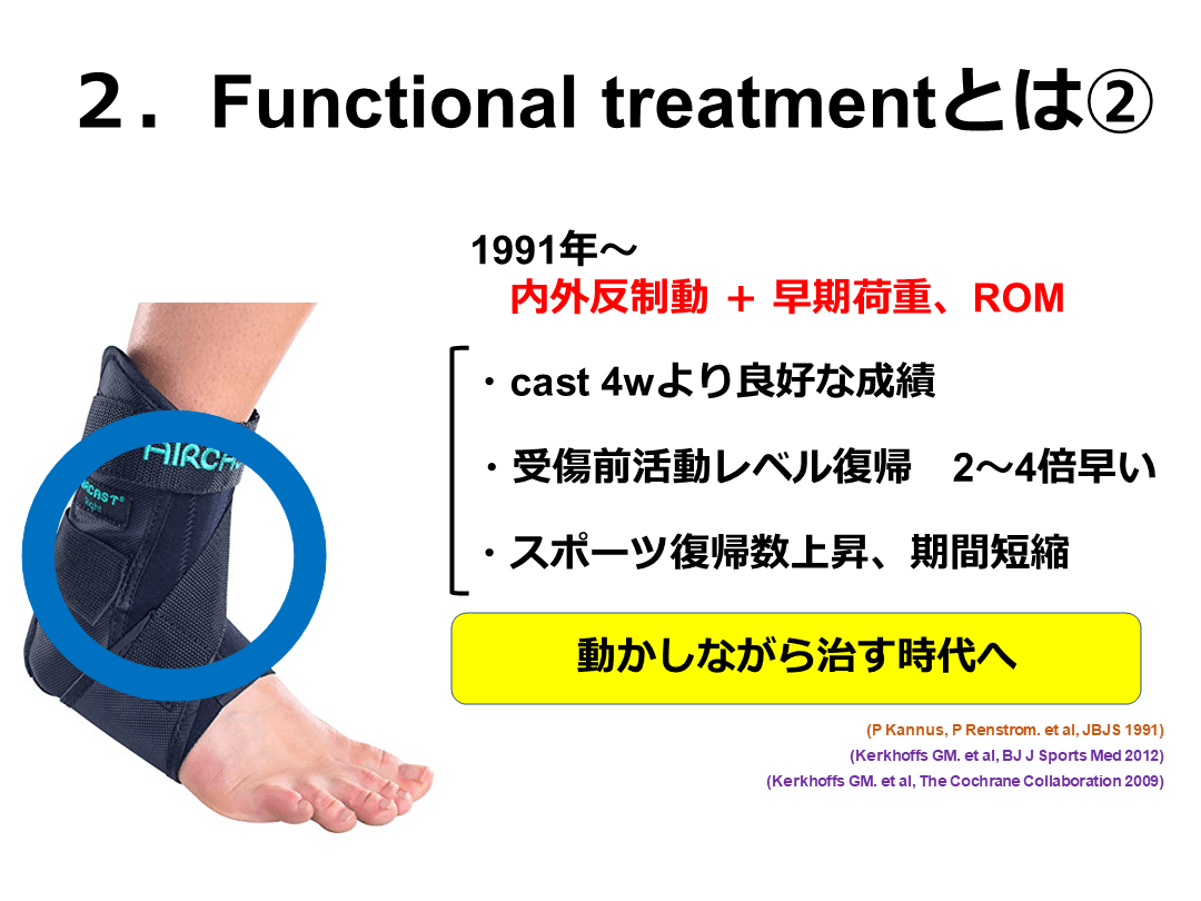 内外反制動 + 早期荷重、ROM ・cast 4wより良好な成績 ・受傷前活動レベル復帰 2~4倍早い ・スポーツ復帰数上昇、期間短縮 動かしながら治す時代へ 2.Functional treatmentとは②