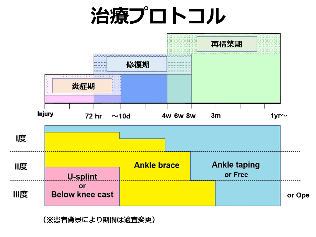 Below knee cast Ankle brace Ankle taping Ankle taping or Ope (※患者背景により期間は適宜変更) or Free 3m