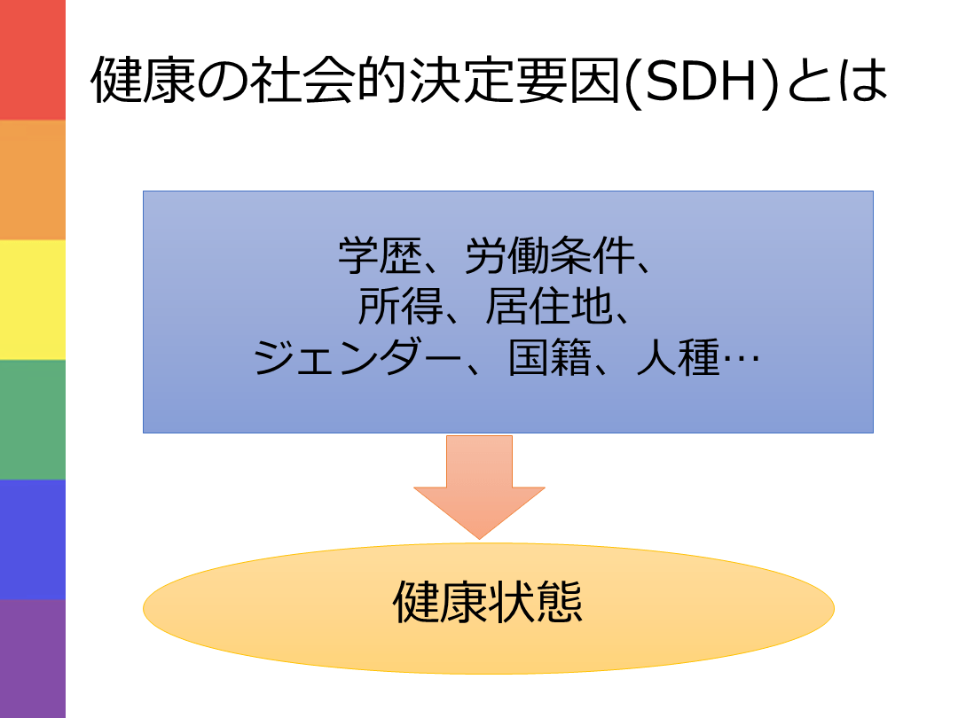 健康の社会的決定要因(SDH)とは 学歴、労働条件、所得、居住地、