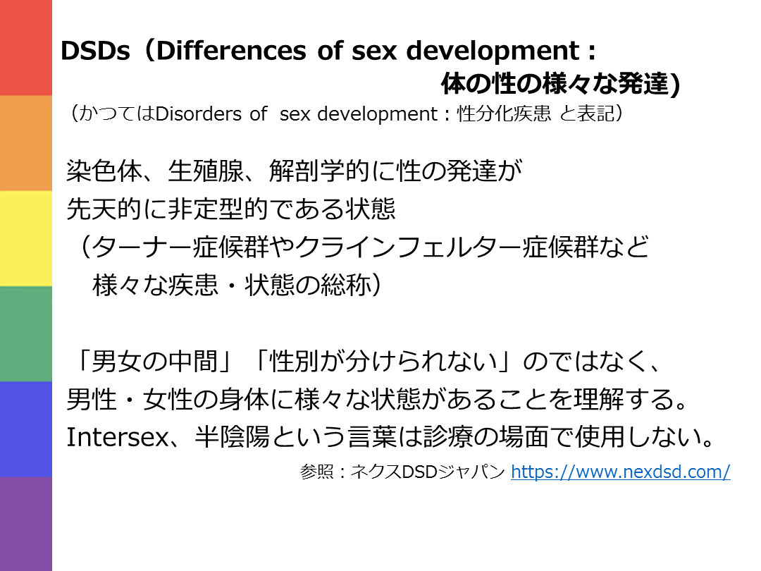 性自認、性的指向、性表現の多様性 #25. DSDs(Differences of sex development: 体の性の様々な発達)(かつてはDisorders of sex development:性分化疾患 と表記) 染色体、生殖腺、解剖学的に性の発達が
