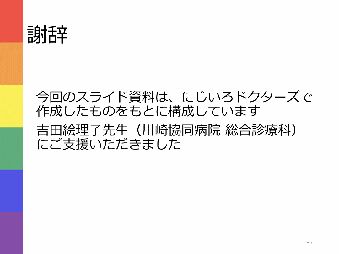 謝辞 今回のスライド資料は、にじいろドクターズで作成したものをもとに構成しています