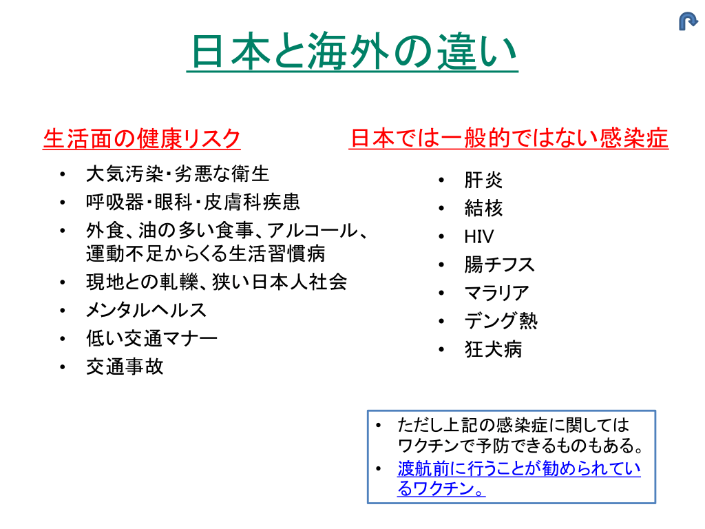 #10. 日本と海外の違い 生活面の健康リスク • • • • • • • 日本では一般的ではない感染症 大気汚染・劣悪な衛生 呼吸器・眼科・皮膚科疾患 外食、油の多い食事、アルコール、 運動不足からくる生活習慣病 現地との軋轢、狭い日本人社会 メンタルヘルス 低い交通マナー 交通事故 • • • • • • • 肝炎 結核 HIV 腸チフス マラリア デング熱 狂犬病 • ただし上記の感染症に関しては ワクチンで予防できるものもある。 • 渡航前に行うことが勧められてい るワクチン。