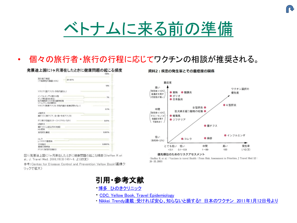 #100. ベトナムに来る前の準備 • 個々の旅行者・旅行の行程に応じてワクチンの相談が推奨される。 引用・参考文献 ・博多 ひのきクリニック ・ CDC, Yellow Book, Travel Epidemiology ・ Nikkei Trendy連載:受ければ安心、知らないと損する!! 日本のワクチン 2011年1月12日号より