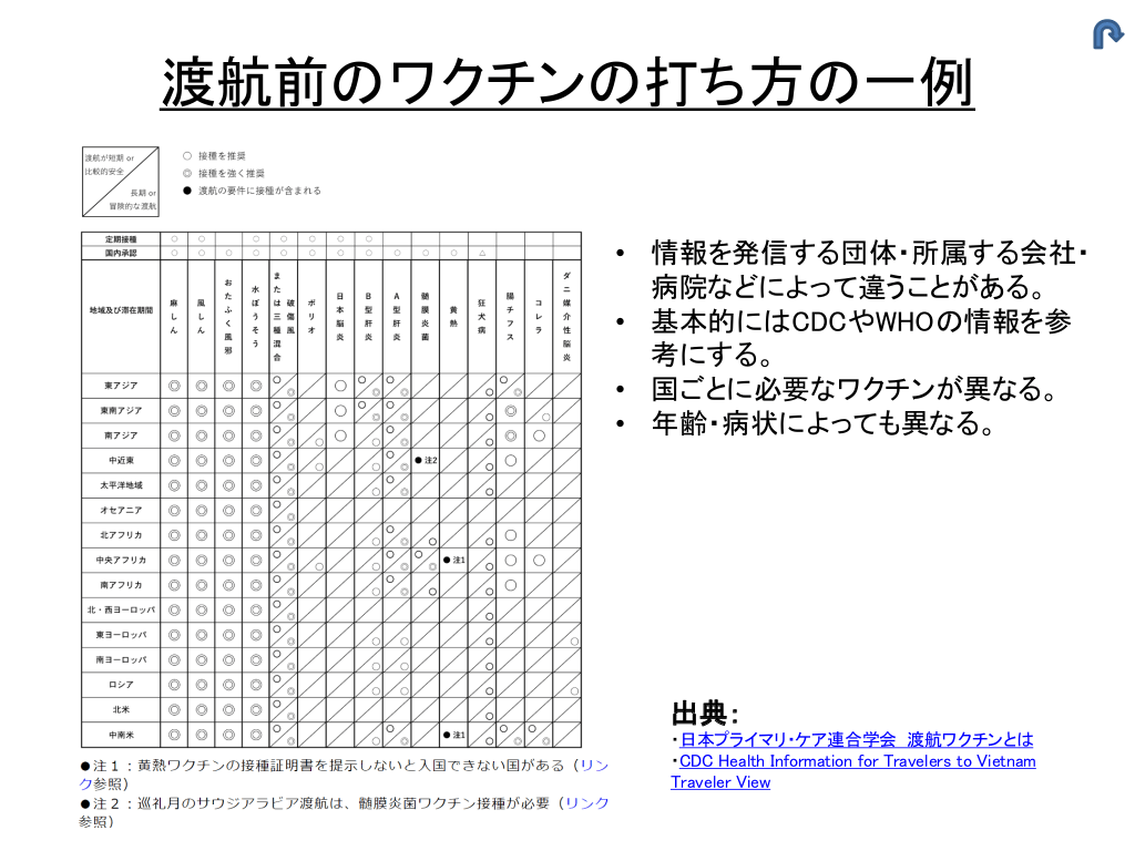 #101. 渡航前のワクチンの打ち方の一例 • 情報を発信する団体・所属する会社・ 病院などによって違うことがある。 • 基本的にはCDCやWHOの情報を参 考にする。 • 国ごとに必要なワクチンが異なる。 • 年齢・病状によっても異なる。 出典: ・日本プライマリ・ケア連合学会 渡航ワクチンとは ・CDC Health Information for Travelers to Vietnam Traveler View