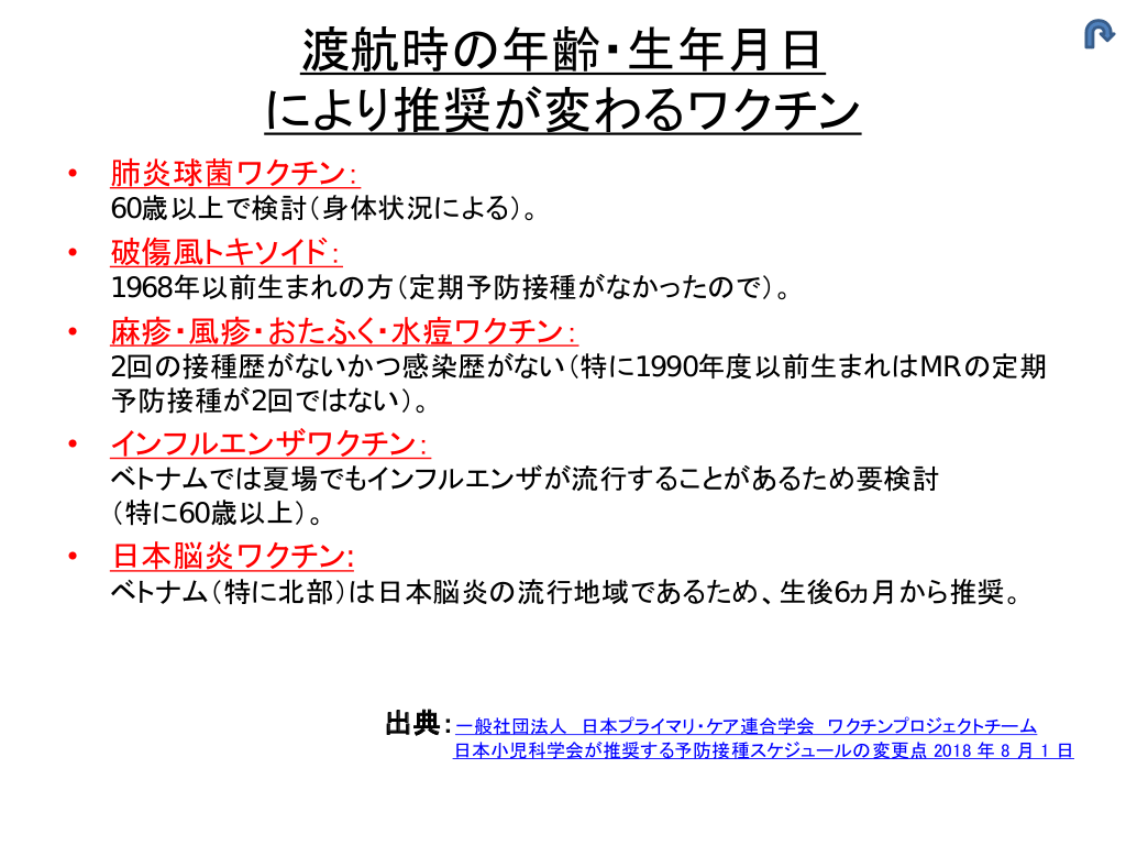 #103. 渡航時の年齢・生年月日 により推奨が変わるワクチン • 肺炎球菌ワクチン: 60歳以上で検討(身体状況による)。 • 破傷風トキソイド: 1968年以前生まれの方(定期予防接種がなかったので)。 • 麻疹・風疹・おたふく・水痘ワクチン: 2回の接種歴がないかつ感染歴がない(特に1990年度以前生まれはMRの定期 予防接種が2回ではない)。 • インフルエンザワクチン: ベトナムでは夏場でもインフルエンザが流行することがあるため要検討 (特に60歳以上)。 • 日本脳炎ワクチン: ベトナム(特に北部)は日本脳炎の流行地域であるため、生後6ヵ月から推奨。 出典:一般社団法人 日本プライマリ・ケア連合学会 ワクチンプロジェクトチーム 日本小児科学会が推奨する予防接種スケジュールの変更点 2018 年 8 月 1 日