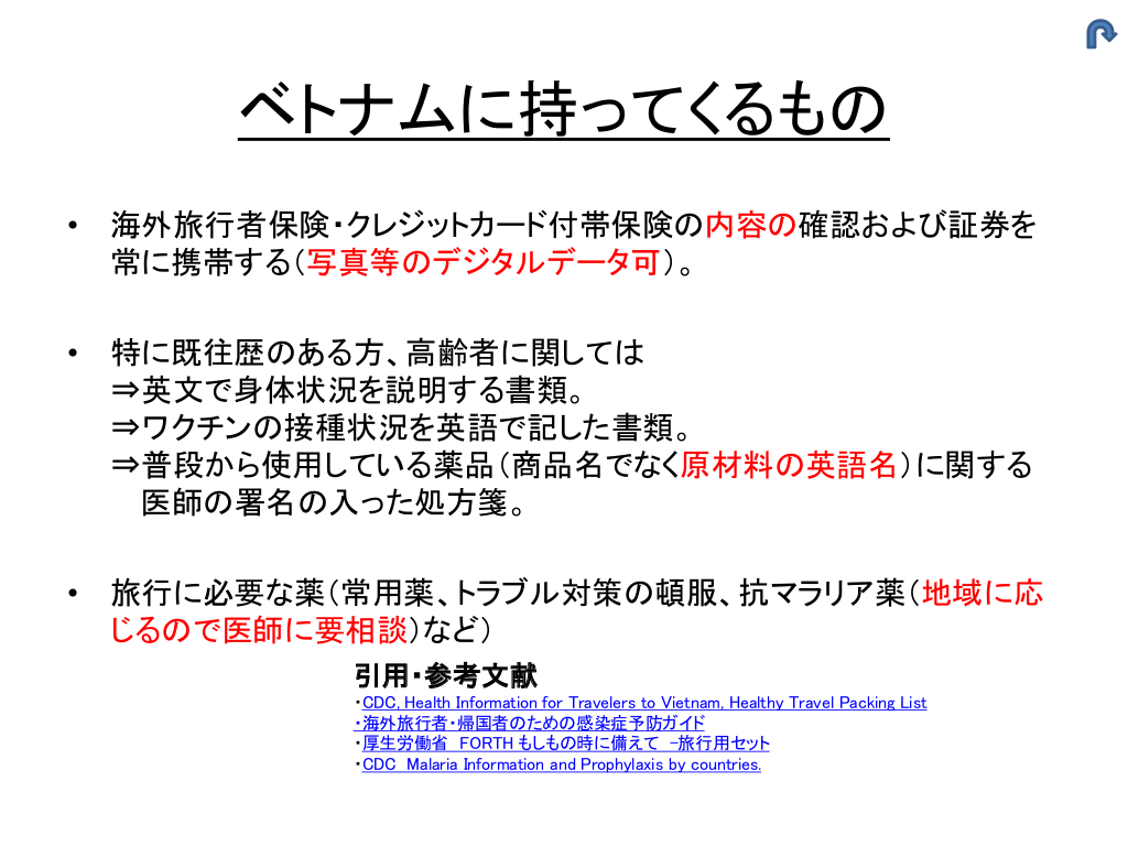 #106. ベトナムに持ってくるもの • 海外旅行者保険・クレジットカード付帯保険の内容の確認および証券を 常に携帯する(写真等のデジタルデータ可)。 • 特に既往歴のある方、高齢者に関しては ⇒英文で身体状況を説明する書類。 ⇒ワクチンの接種状況を英語で記した書類。 ⇒普段から使用している薬品(商品名でなく原材料の英語名)に関する 医師の署名の入った処方箋。 • 旅行に必要な薬(常用薬、トラブル対策の頓服、抗マラリア薬(地域に応 じるので医師に要相談)など) 引用・参考文献 ・CDC, Health Information for Travelers to Vietnam, Healthy Travel Packing List ・海外旅行者・帰国者のための感染症予防ガイド ・厚生労働省 FORTH もしもの時に備えて -旅行用セット ・CDC Malaria Information and Prophylaxis by countries.
