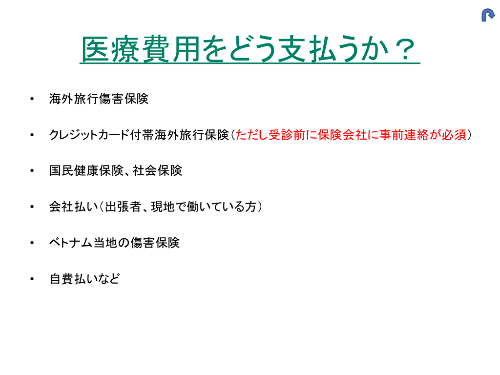 #107. 医療費用をどう支払うか? • 海外旅行傷害保険 • クレジットカード付帯海外旅行保険(ただし受診前に保険会社に事前連絡が必須) • 国民健康保険、社会保険 • 会社払い(出張者、現地で働いている方) • ベトナム当地の傷害保険 • 自費払いなど