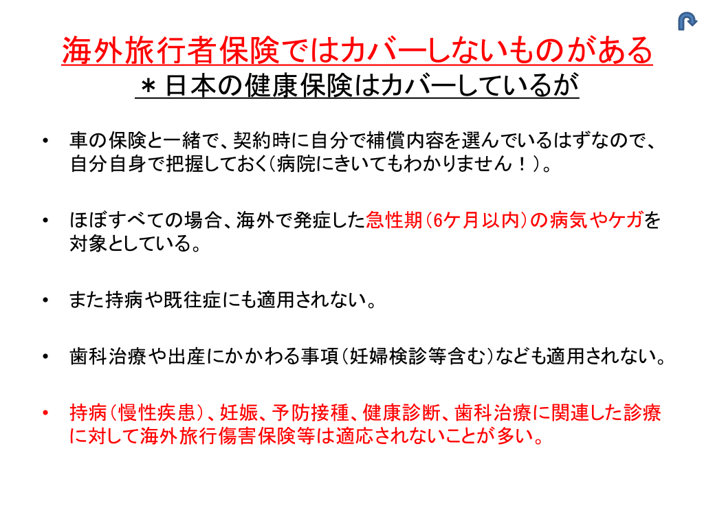 #108. 海外旅行者保険ではカバーしないものがある *日本の健康保険はカバーしているが • 車の保険と一緒で、契約時に自分で補償内容を選んでいるはずなので、 自分自身で把握しておく(病院にきいてもわかりません!)。 • ほぼすべての場合、海外で発症した急性期(6ケ月以内)の病気やケガを 対象としている。 • また持病や既往症にも適用されない。 • 歯科治療や出産にかかわる事項(妊婦検診等含む)なども適用されない。 • 持病(慢性疾患)、妊娠、予防接種、健康診断、歯科治療に関連した診療 に対して海外旅行傷害保険等は適応されないことが多い。
