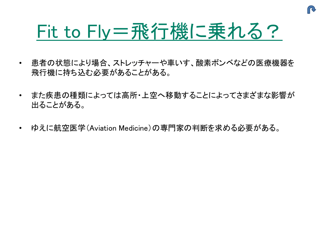 #109. Fit to Fly=飛行機に乗れる? • 患者の状態により場合、ストレッチャーや車いす、酸素ボンベなどの医療機器を 飛行機に持ち込む必要があることがある。 • また疾患の種類によっては高所・上空へ移動することによってさまざまな影響が 出ることがある。 • ゆえに航空医学(Aviation Medicine)の専門家の判断を求める必要がある。