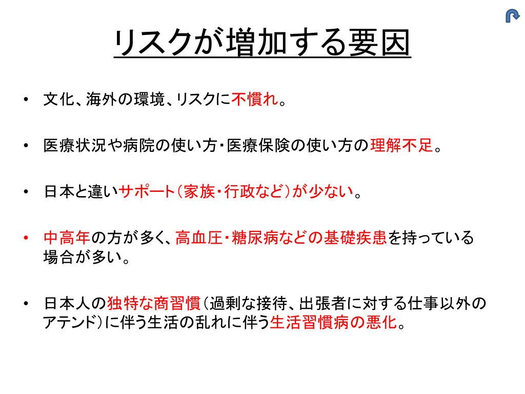 #11. リスクが増加する要因 • 文化、海外の環境、リスクに不慣れ。 • 医療状況や病院の使い方・医療保険の使い方の理解不足。 • 日本と違いサポート(家族・行政など)が少ない。 • 中高年の方が多く、高血圧・糖尿病などの基礎疾患を持っている 場合が多い。 • 日本人の独特な商習慣(過剰な接待、出張者に対する仕事以外の アテンド)に伴う生活の乱れに伴う生活習慣病の悪化。