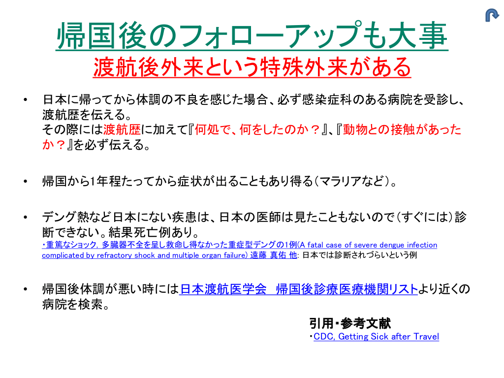#110. 帰国後のフォローアップも大事 渡航後外来という特殊外来がある • 日本に帰ってから体調の不良を感じた場合、必ず感染症科のある病院を受診し、 渡航歴を伝える。 その際には渡航歴に加えて『何処で、何をしたのか?』、『動物との接触があった か?』を必ず伝える。 • 帰国から1年程たってから症状が出ることもあり得る(マラリアなど)。 • デング熱など日本にない疾患は、日本の医師は見たこともないので(すぐには)診 断できない。結果死亡例あり。 ・重篤なショック,多臓器不全を呈し救命し得なかった重症型デングの1例(A fatal case of severe dengue infection complicated by refractory shock and multiple organ failure) 遠藤 真佑 他: 日本では診断されづらいという例 • 帰国後体調が悪い時には日本渡航医学会 帰国後診療医療機関リストより近くの 病院を検索。 引用・参考文献 ・CDC, Getting Sick after Travel