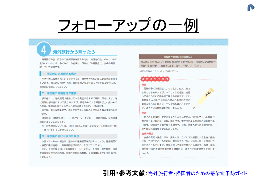 #111. フォローアップの一例 引用・参考文献:海外旅行者・帰国者のための感染症予防ガイド