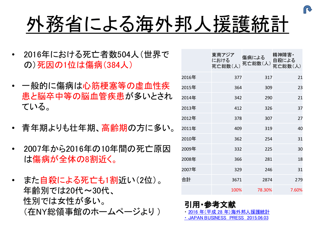 #12. 外務省による海外邦人援護統計 • 2016年における死亡者数504人(世界で の)死因の1位は傷病(384人) • 一般的に傷病は心筋梗塞等の虚血性疾 患と脳卒中等の脳血管疾患が多いとされ ている。 • 青年期よりも壮年期、高齢期の方に多い。 • 2007年から2016年の10年間の死亡原因 は傷病が全体の8割近く。 • また自殺による死亡も1割近い(2位)。 年齢別では20代~30代、 性別では女性が多い。 (在NY総領事館のホームページより ) 東南アジア 精神障害・ 傷病による における 自殺による 死亡総数(人) 死亡総数(人) 死亡総数(人) 2016年 377 317 21 2015年 364 309 23 2014年 342 290 21 2013年 412 326 37 2012年 378 307 27 2011年 409 319 40 2010年 362 254 31 2009年 332 225 30 2008年 366 281 18 2007年 329 246 31 3671 2874 279 100% 78.30% 7.60% 合計 引用・参考文献 ・ 2016 年(平成 28 年)海外邦人援護統計 ・ JAPAN BUSINESS PRESS 2015.06.03