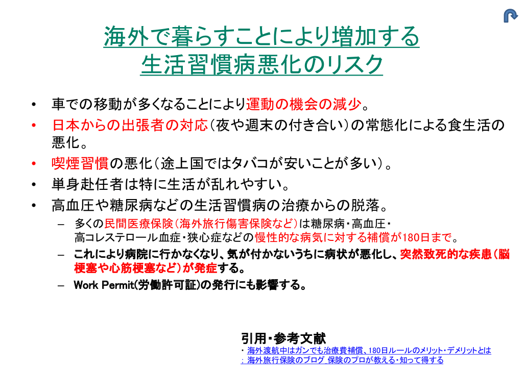 #13. 海外で暮らすことにより増加する 生活習慣病悪化のリスク • 車での移動が多くなることにより運動の機会の減少。 • 日本からの出張者の対応(夜や週末の付き合い)の常態化による食生活の 悪化。 • 喫煙習慣の悪化(途上国ではタバコが安いことが多い)。 • 単身赴任者は特に生活が乱れやすい。 • 高血圧や糖尿病などの生活習慣病の治療からの脱落。 – 多くの民間医療保険(海外旅行傷害保険など)は糖尿病・高血圧・ 高コレステロール血症・狭心症などの慢性的な病気に対する補償が180日まで。 – これにより病院に行かなくなり、気が付かないうちに病状が悪化し、突然致死的な疾患(脳 梗塞や心筋梗塞など)が発症する。 – Work Permit(労働許可証)の発行にも影響する。 引用・参考文献 ・ 海外渡航中はガンでも治療費補償、180日ルールのメリット・デメリットとは ; 海外旅行保険のブログ_保険のプロが教える・知って得する