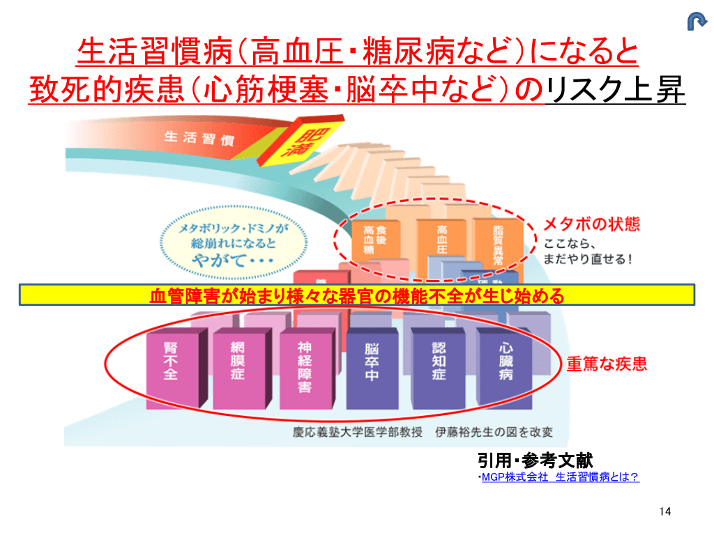#14. 生活習慣病(高血圧・糖尿病など)になると 致死的疾患(心筋梗塞・脳卒中など)のリスク上昇 血管障害が始まり様々な器官の機能不全が生じ始める 引用・参考文献 ・MGP株式会社 生活習慣病とは? 14