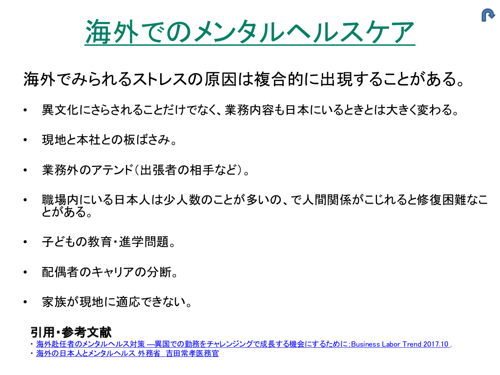 #15. 海外でのメンタルヘルスケア 海外でみられるストレスの原因は複合的に出現することがある。 • 異文化にさらされることだけでなく、業務内容も日本にいるときとは大きく変わる。 • 現地と本社との板ばさみ。 • 業務外のアテンド(出張者の相手など)。 • 職場内にいる日本人は少人数のことが多いの、で人間関係がこじれると修復困難なこ とがある。 • 子どもの教育・進学問題。 • 配偶者のキャリアの分断。 • 家族が現地に適応できない。 引用・参考文献 ・ 海外赴任者のメンタルヘルス対策 ―異国での勤務をチャレンジングで成長する機会にするために;Business Labor Trend 2017.10 . ・ 海外の日本人とメンタルヘルス 外務省 吉田常孝医務官