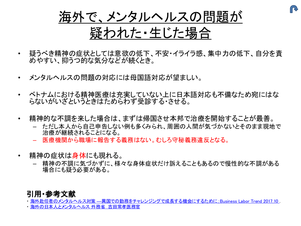 #16. 海外で、メンタルヘルスの問題が 疑われた・生じた場合 • 疑うべき精神の症状としては意欲の低下、不安・イライラ感、集中力の低下、自分を責 めやすい、抑うつ的な気分などが続くとき。 • メンタルヘルスの問題の対応には母国語対応が望ましい。 • ベトナムにおける精神医療は充実していない上に日本語対応も不備なため宛にはな らないがいざというときはためらわず受診する・させる。 • 精神的な不調を来した場合は、まずは帰国させ本邦で治療を開始することが最善。 – ただし本人から自己申告しない例も多くみられ、周囲の人間が気づかないとそのまま現地で 治療が継続されることになる。 – 医療機関から職場に報告する義務はない。むしろ守秘義務違反となる。 • 精神の症状は身体にも現れる。 – 精神の不調に気づかずに、様々な身体症状だけ訴えることもあるので慢性的な不調がある 場合にも疑う必要がある。 引用・参考文献 ・ 海外赴任者のメンタルヘルス対策 ―異国での勤務をチャレンジングで成長する機会にするために;Business Labor Trend 2017.10 . ・ 海外の日本人とメンタルヘルス 外務省 吉田常孝医務官