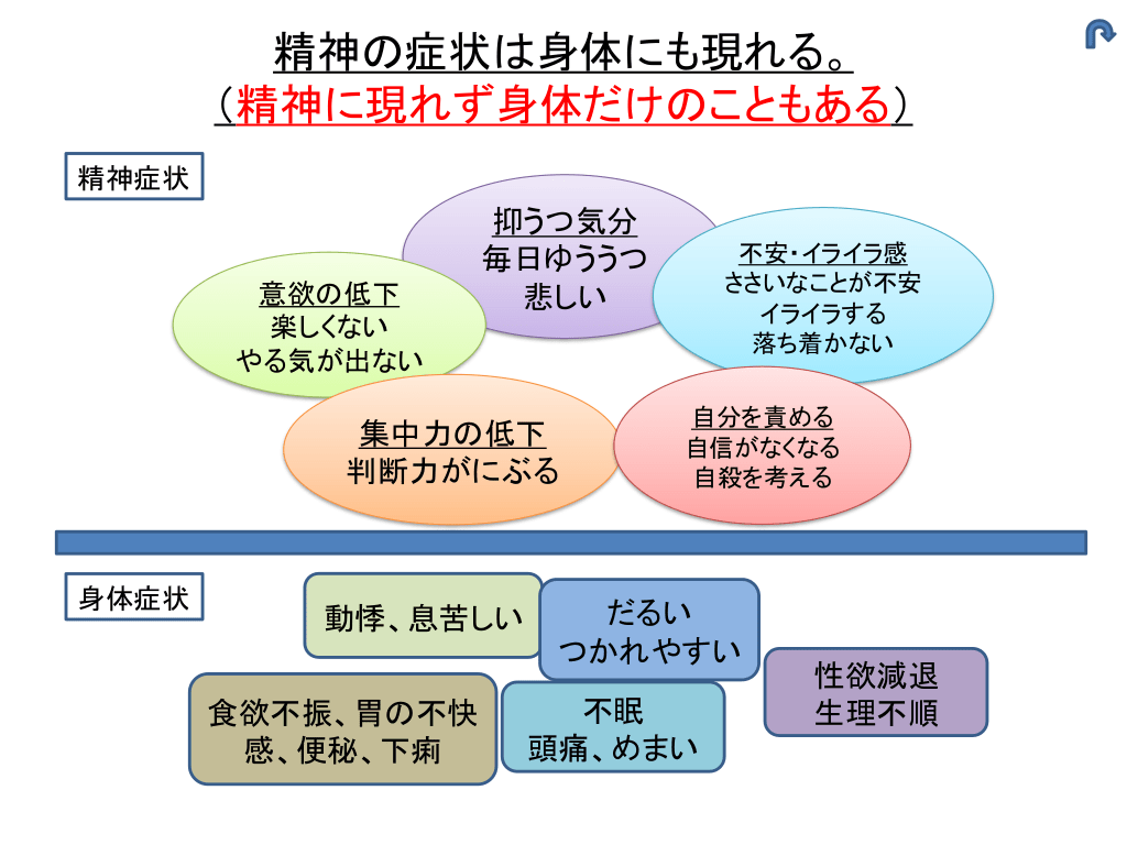 #17. 精神の症状は身体にも現れる。 (精神に現れず身体だけのこともある) 精神症状 意欲の低下 楽しくない やる気が出ない 抑うつ気分 毎日ゆううつ 悲しい 集中力の低下 判断力がにぶる 身体症状 動悸、息苦しい 食欲不振、胃の不快 感、便秘、下痢 不安・イライラ感 ささいなことが不安 イライラする 落ち着かない 自分を責める 自信がなくなる 自殺を考える だるい つかれやすい 不眠 頭痛、めまい 性欲減退 生理不順