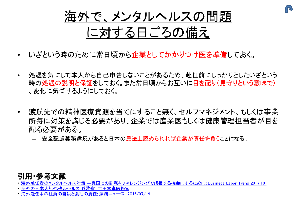 #18. 海外で、メンタルヘルスの問題 に対する日ごろの備え • いざという時のために常日頃から企業としてかかりつけ医を準備しておく。 • 処遇を気にして本人から自己申告しないことがあるため、赴任前にしっかりとしたいざという 時の処遇の説明と保証をしておく。また常日頃からお互いに目を配り(見守りという意味で) 、変化に気づけるようにしておく。 • 渡航先での精神医療資源を当てにすること無く、セルフマネジメント、もしくは事業 所毎に対策を講じる必要があり、企業では産業医もしくは健康管理担当者が目を 配る必要がある。 – 安全配慮義務違反があると日本の民法上認められれば企業が責任を負うことになる。 引用・参考文献 ・ 海外赴任者のメンタルヘルス対策 ―異国での勤務をチャレンジングで成長する機会にするために;Business Labor Trend 2017.10 . ・ 海外の日本人とメンタルヘルス 外務省 吉田常孝医務官 ・ 海外赴任中の社員の自殺と会社の責任; 法務ニュース 2016/07/19