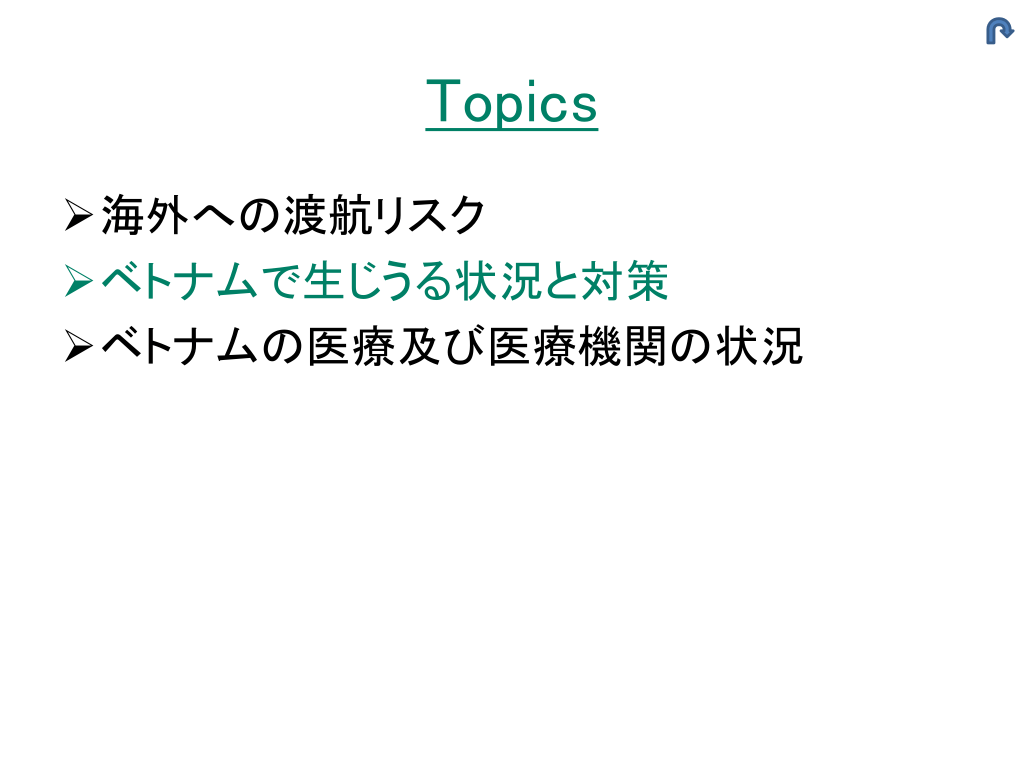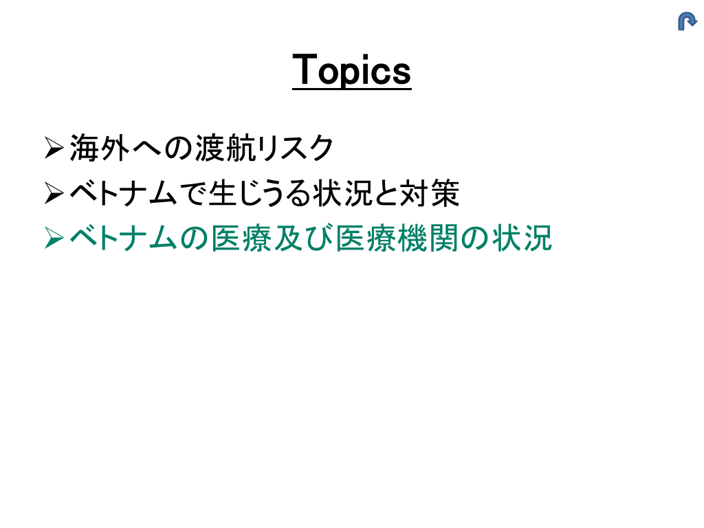 #86. Topics ➢海外への渡航リスク ➢ベトナムで生じうる状況と対策 ➢ベトナムの医療及び医療機関の状況