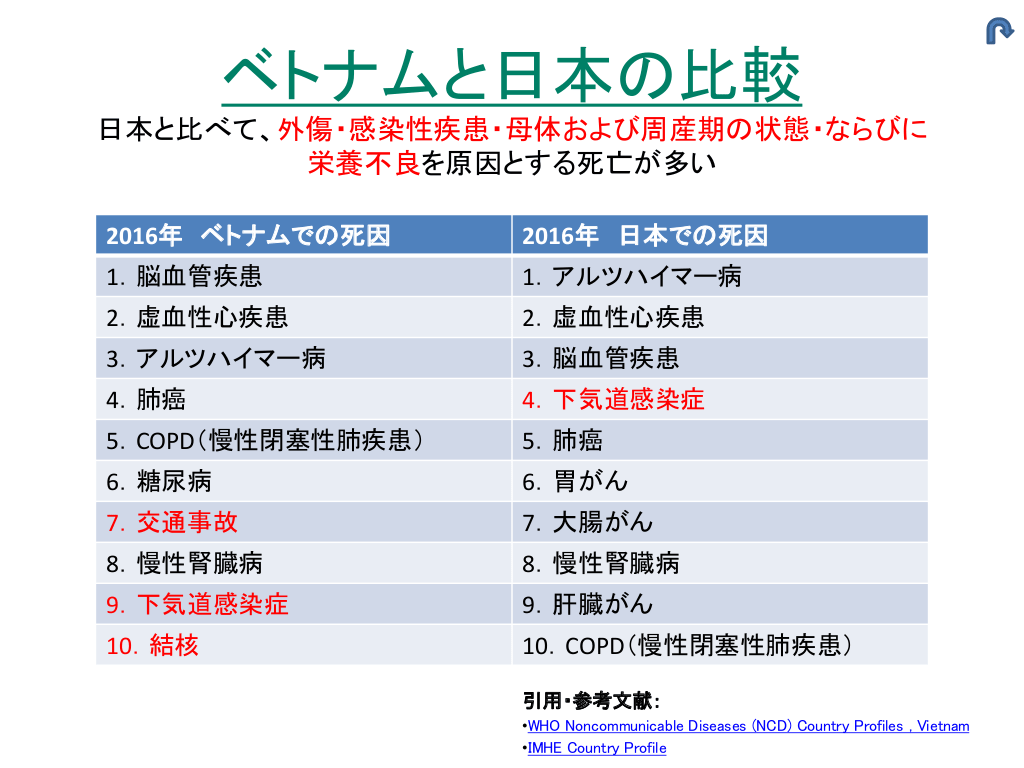 #20. ベトナムと日本の比較 日本と比べて、外傷・感染性疾患・母体および周産期の状態・ならびに 栄養不良を原因とする死亡が多い 2016年 ベトナムでの死因 2016年 日本での死因 1.脳血管疾患 1.アルツハイマー病 2.虚血性心疾患 2.虚血性心疾患 3.アルツハイマー病 3.脳血管疾患 4.肺癌 4.下気道感染症 5.COPD(慢性閉塞性肺疾患) 5.肺癌 6.糖尿病 6.胃がん 7.交通事故 7.大腸がん 8.慢性腎臓病 8.慢性腎臓病 9.下気道感染症 9.肝臓がん 10.結核 10.COPD(慢性閉塞性肺疾患) 引用・参考文献: •WHO Noncommunicable Diseases (NCD) Country Profiles , Vietnam •IMHE Country Profile