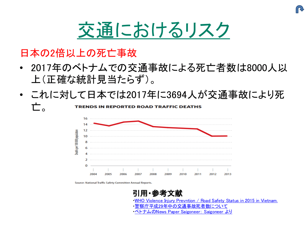 #22. 交通におけるリスク 日本の2倍以上の死亡事故 • 2017年のベトナムでの交通事故による死亡者数は8000人以 上(正確な統計見当たらず)。 • これに対して日本では2017年に3694人が交通事故により死 亡。 引用・参考文献 ・WHO Violence Injury Prevntion / Road Safety Status in 2015 in Vietnam. ・警察庁平成29年中の交通事故死者数について ・ベトナムのNews Paper Saigoneer: Saigoneer より