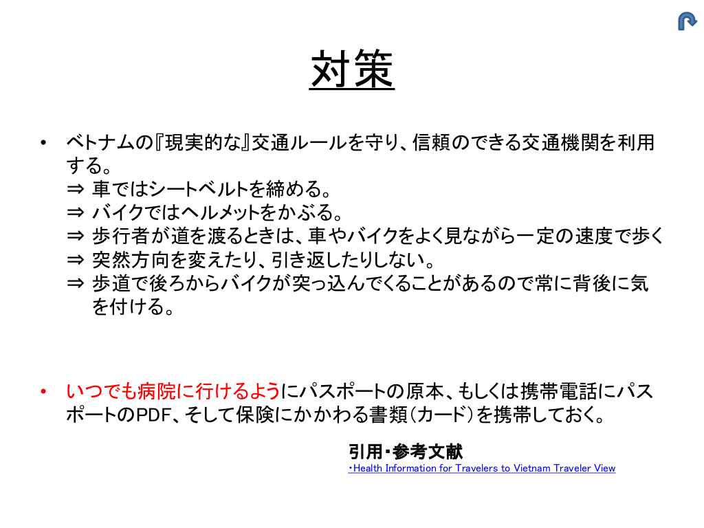 #23. 対策 • ベトナムの『現実的な』交通ルールを守り、信頼のできる交通機関を利用 する。 ⇒ 車ではシートベルトを締める。 ⇒ バイクではヘルメットをかぶる。 ⇒ 歩行者が道を渡るときは、車やバイクをよく見ながら一定の速度で歩く ⇒ 突然方向を変えたり、引き返したりしない。 ⇒ 歩道で後ろからバイクが突っ込んでくることがあるので常に背後に気 を付ける。 • いつでも病院に行けるようにパスポートの原本、もしくは携帯電話にパス ポートのPDF、そして保険にかかわる書類(カード)を携帯しておく。 引用・参考文献 ・Health Information for Travelers to Vietnam Traveler View