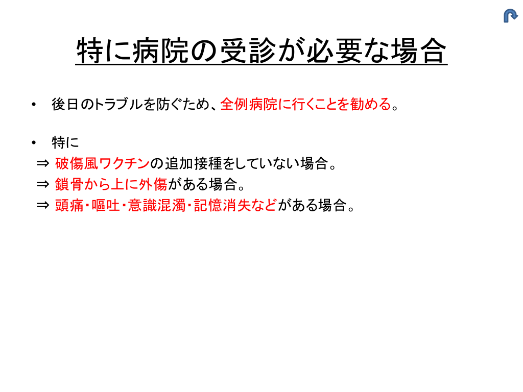 #24. 特に病院の受診が必要な場合 • 後日のトラブルを防ぐため、全例病院に行くことを勧める。 • 特に ⇒ 破傷風ワクチンの追加接種をしていない場合。 ⇒ 鎖骨から上に外傷がある場合。 ⇒ 頭痛・嘔吐・意識混濁・記憶消失などがある場合。