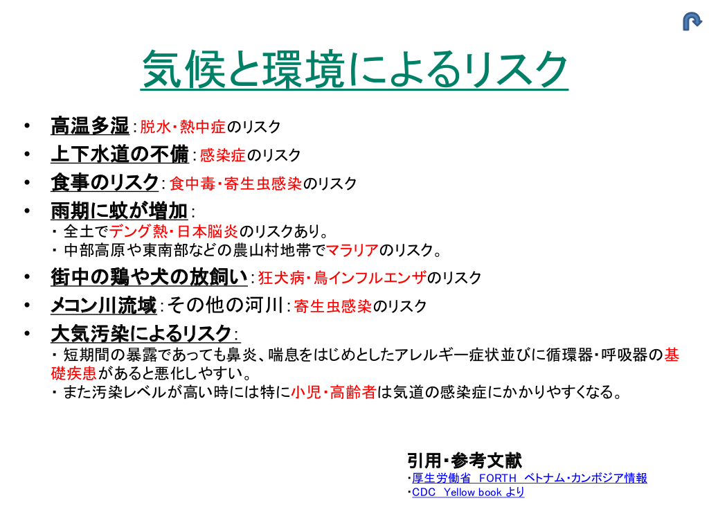 #25. 気候と環境によるリスク • • • • 高温多湿:脱水・熱中症のリスク 上下水道の不備:感染症のリスク 食事のリスク:食中毒・寄生虫感染のリスク 雨期に蚊が増加: ・ 全土でデング熱・日本脳炎のリスクあり。 ・ 中部高原や東南部などの農山村地帯でマラリアのリスク。 • 街中の鶏や犬の放飼い:狂犬病・鳥インフルエンザのリスク • メコン川流域:その他の河川:寄生虫感染のリスク • 大気汚染によるリスク: ・ 短期間の暴露であっても鼻炎、喘息をはじめとしたアレルギー症状並びに循環器・呼吸器の基 礎疾患があると悪化しやすい。 ・ また汚染レベルが高い時には特に小児・高齢者は気道の感染症にかかりやすくなる。 引用・参考文献 ・厚生労働省 FORTH ベトナム・カンボジア情報 ・CDC Yellow book より