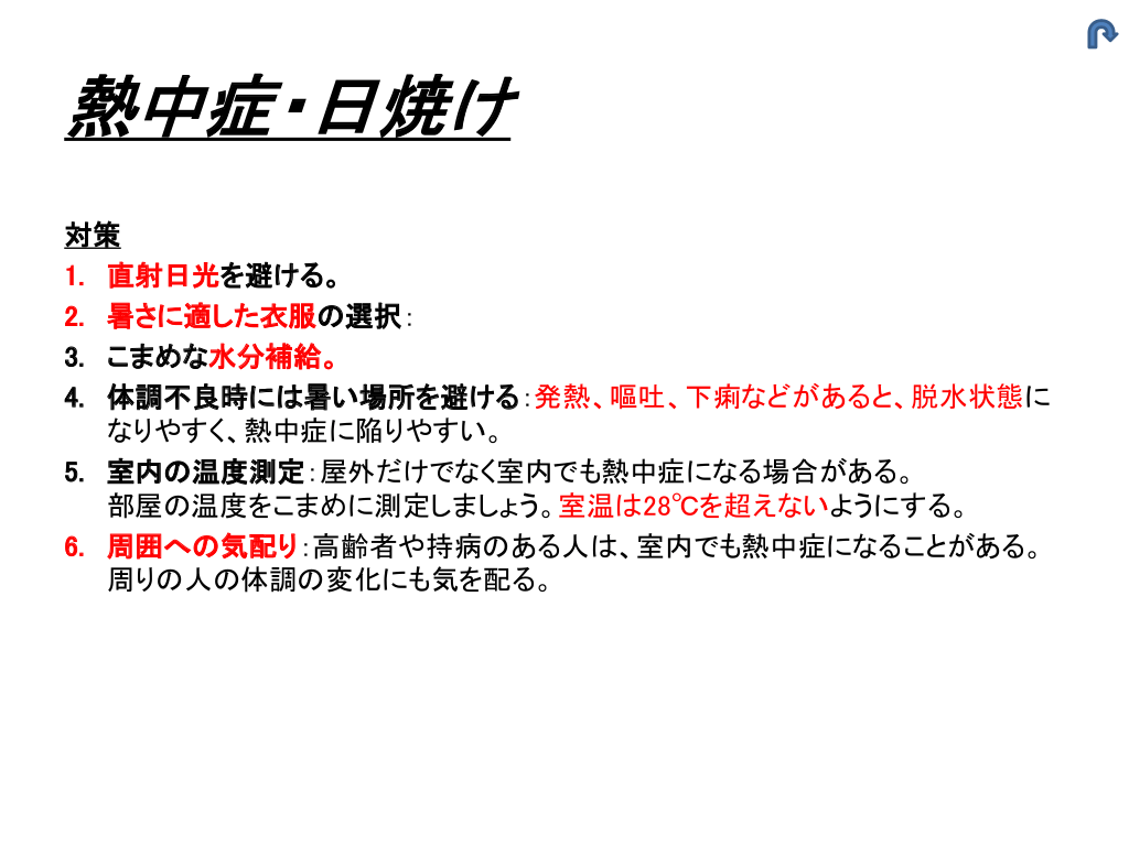 #26. 熱中症・日焼け 対策 1. 直射日光を避ける。 2. 暑さに適した衣服の選択: 3. こまめな水分補給。 4. 体調不良時には暑い場所を避ける:発熱、嘔吐、下痢などがあると、脱水状態に なりやすく、熱中症に陥りやすい。 5. 室内の温度測定:屋外だけでなく室内でも熱中症になる場合がある。 部屋の温度をこまめに測定しましょう。室温は28℃を超えないようにする。 6. 周囲への気配り:高齢者や持病のある人は、室内でも熱中症になることがある。 周りの人の体調の変化にも気を配る。