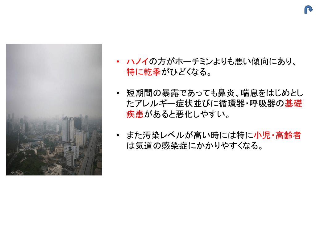 #29. • ハノイの方がホーチミンよりも悪い傾向にあり、 特に乾季がひどくなる。 • 短期間の暴露であっても鼻炎、喘息をはじめとし たアレルギー症状並びに循環器・呼吸器の基礎 疾患があると悪化しやすい。 • また汚染レベルが高い時には特に小児・高齢者 は気道の感染症にかかりやすくなる。