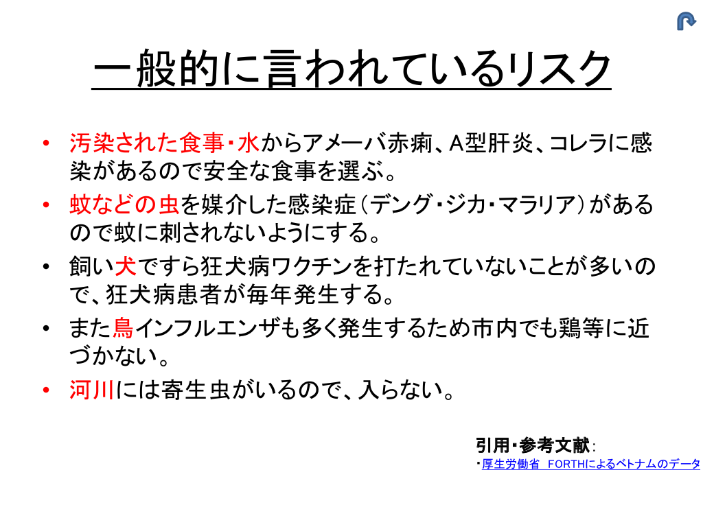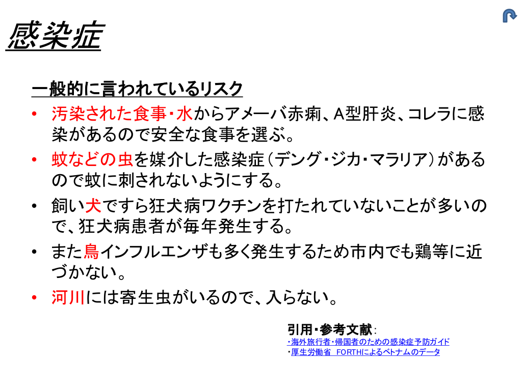#36. 一般的に言われているリスク • 汚染された食事・水からアメーバ赤痢、A型肝炎、コレラに感 染があるので安全な食事を選ぶ。 • 蚊などの虫を媒介した感染症(デング・ジカ・マラリア)がある ので蚊に刺されないようにする。 • 飼い犬ですら狂犬病ワクチンを打たれていないことが多いの で、狂犬病患者が毎年発生する。 • また鳥インフルエンザも多く発生するため市内でも鶏等に近 づかない。 • 河川には寄生虫がいるので、入らない。 引用・参考文献: ・厚生労働省 FORTHによるベトナムのデータ