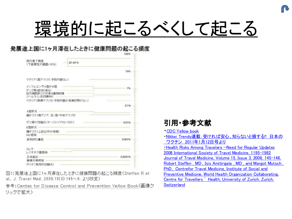 #35. 環境的に起こるべくして起こる 引用・参考文献 ・CDC Yellow book ・Nikkei Trendy連載:受ければ安心、知らないと損する!! 日本の ワクチン 2011年1月12日号より ・Health Risks Among Travelers —Need for Regular Updates 2008 International Society of Travel Medicine, 1195-1982 Journal of Travel Medicine, Volume 15, Issue 3, 2008, 145–146, Robert Steffen , MD , Isis Amitirigala , MD , and Margot Mutsch , PhD, Centrefor Travel Medicine, Institute of Social and Preventive Medicine, World Health Organization Collaborating, Centre for Travellers ’ Health, University of Zurich, Zurich, Switzerland