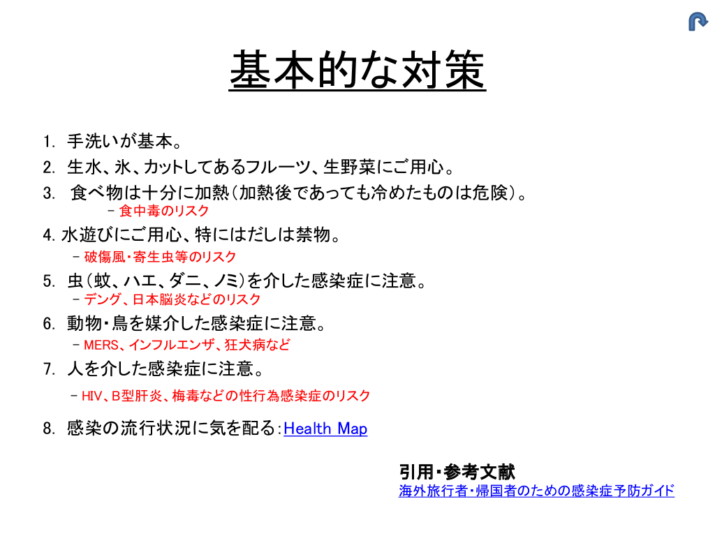 #37. 基本的な対策 1. 手洗いが基本。 2. 生水、氷、カットしてあるフルーツ、生野菜にご用心。 3. 食べ物は十分に加熱(加熱後であっても冷めたものは危険)。 - 食中毒のリスク 4. 水遊びにご用心、特にはだしは禁物。 - 破傷風・寄生虫等のリスク 5. 虫(蚊、ハエ、ダニ、ノミ)を介した感染症に注意。 - デング、日本脳炎などのリスク 6. 動物・鳥を媒介した感染症に注意。 - MERS、インフルエンザ、狂犬病など 7. 人を介した感染症に注意。 - HIV、B型肝炎、梅毒などの性行為感染症のリスク 8. 感染の流行状況に気を配る:Health Map 引用・参考文献 海外旅行者・帰国者のための感染症予防ガイド